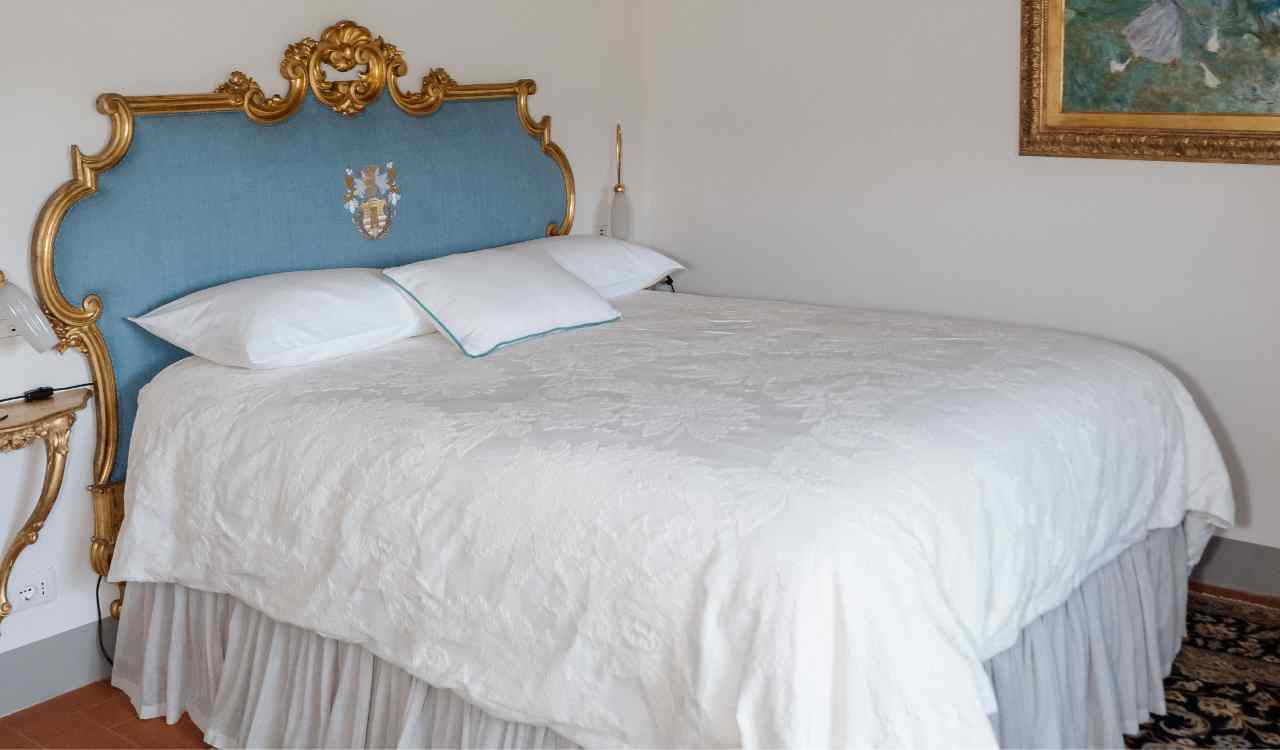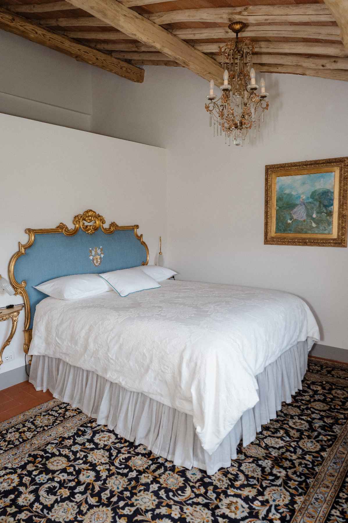 SOLEeVINO B&BThe Deluxe Blue Room draws inspiration from magnificent 18th-century blue doors and carries a sense of understated grandeur. Thoughtfully curated, the room balances historic character with contemporary comfort. A custom made queen bed with a premium mattress invites complete relaxation, while carefully chosen antique accents, a statement Italian chandelier, and a richly woven Persian rug create depth and warmth. The window offers views of the vineyards, offering a peaceful and picturesque outlook.€ 380 per nightDeluxe Double Queen Room