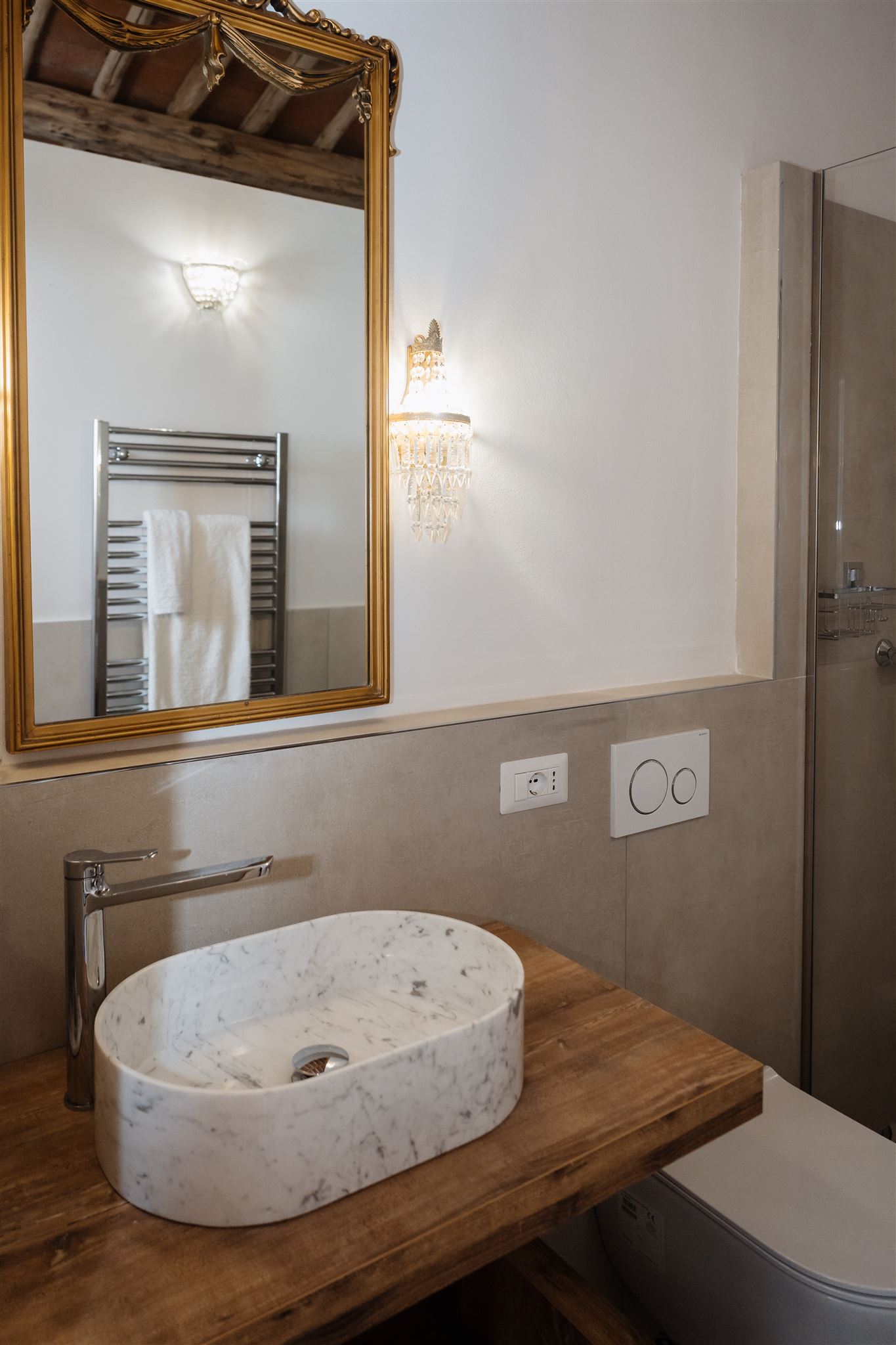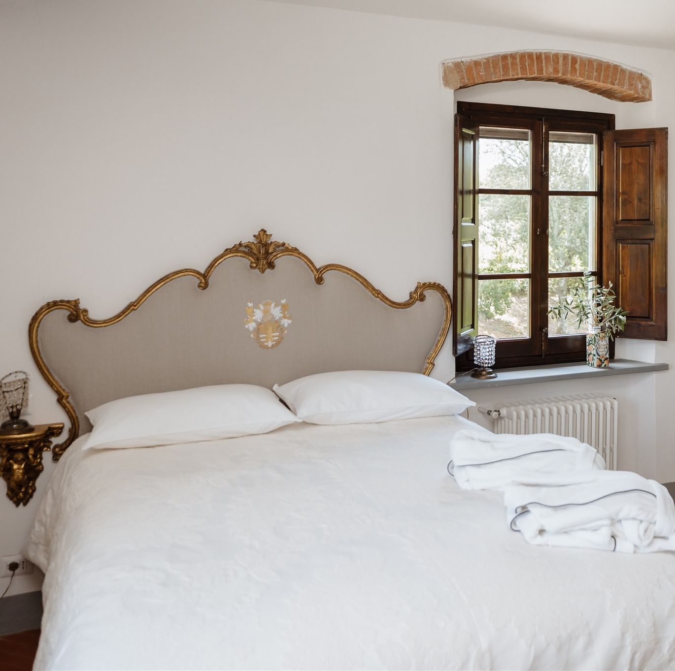 SOLEeVINO B&BThe Deluxe Green Room blends rich green hues with handcrafted Florentine lamps to create a refined, inviting retreat. A custom queen bed with a premium mattress ensures the ultimate in comfort, while an antique bedhead, Italian chandeliers, and a hand-woven Persian rug bring warmth, character, and timeless elegance to the space. From your room you can relax and take in lovely views over the vineyard.€ 360 per nightDeluxe Gold Room